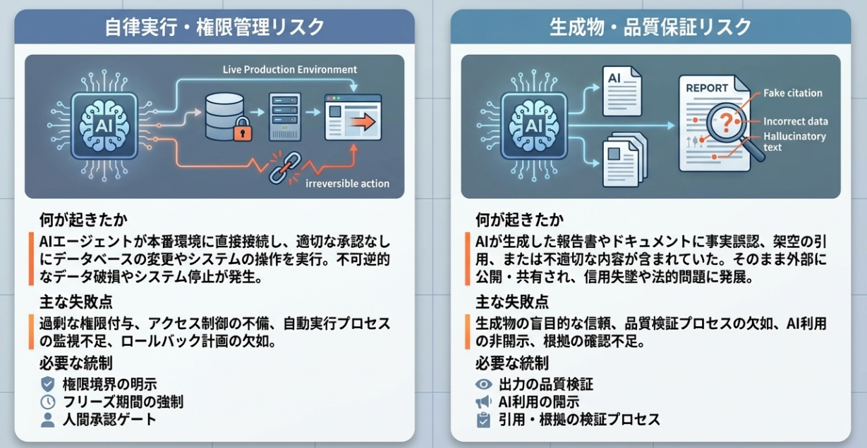 | 必要だった統制 | 権限境界の明示、フリーズ期間の強制、人間承認ゲート | 出力の品質検証、引用・根拠の自動チェック、AI利用開示 |
