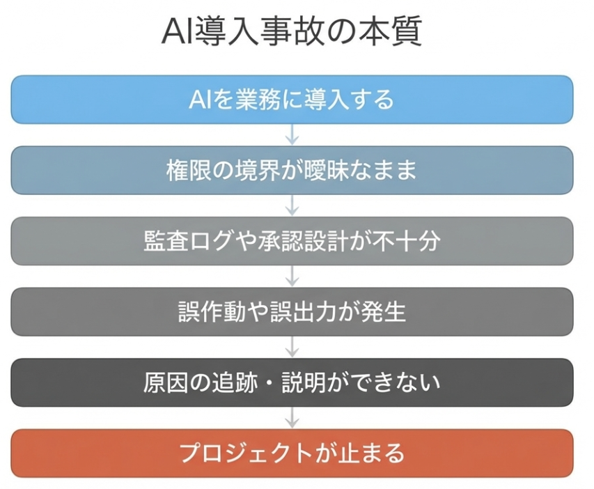 問題の本質は、AIの精度ではありません。AIを業務に組み込んだときの権限・監査・責任・人間介入点の設計にあります。