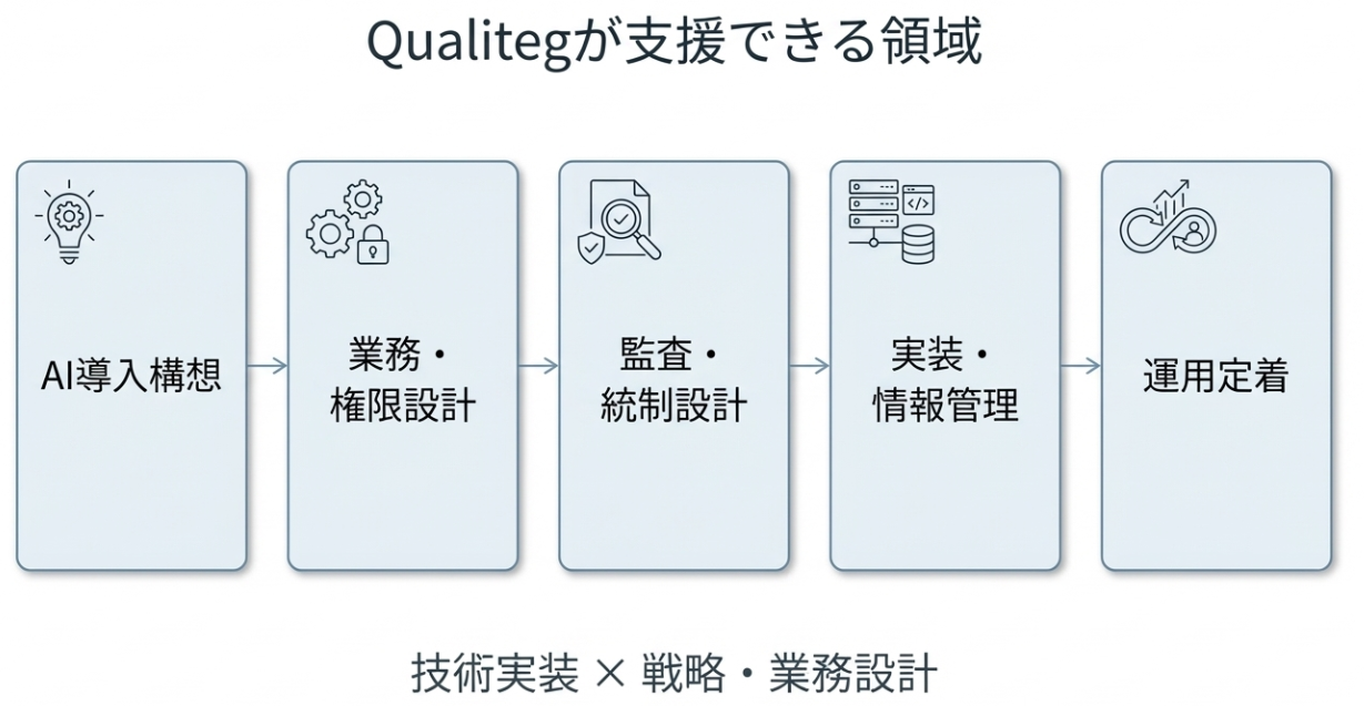 AIエージェントの導入では、モデル選定やPoCだけでなく、業務プロセスの再設計、権限設計、監査可能性、情報管理、品質管理、ROIの可視化までを接続して考えることが重要です。Qualitegは、戦略と技術を分断しない体制で、こうした課題に向き合います。