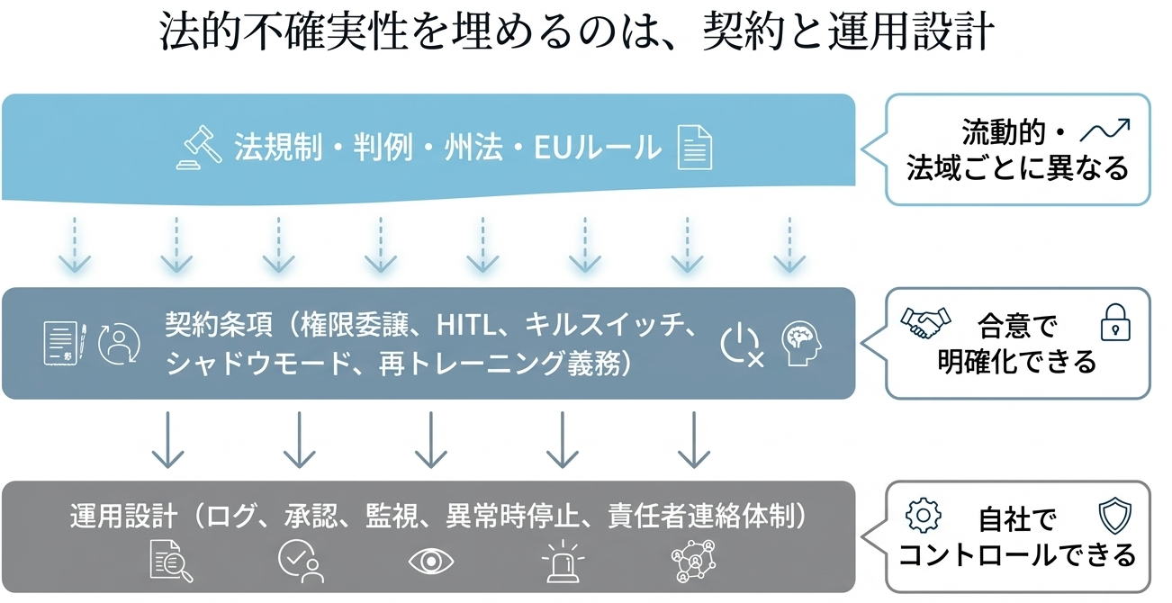 以下の図は、この法的不確実性の中で、契約と運用設計がどのような役割を果たすかを示しています。