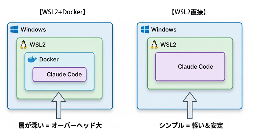 WSL2 + Dockerという選択肢もあります。ただし、Windows上のDocker DesktopはWSL2をバックエンドにする構成が一般的で、実質的には「WSL2の上にDockerが乗る」形になりやすいです。隔離の設計としては理解しやすい一方で、オーバーヘッドや運用コストが増え、体感が重くなることがあります。