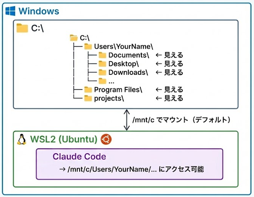 つまり、WSL2内で動くClaude Codeが /mnt/c/Users/... 経由でWindows側のファイルにアクセスできる状態になり得ます。