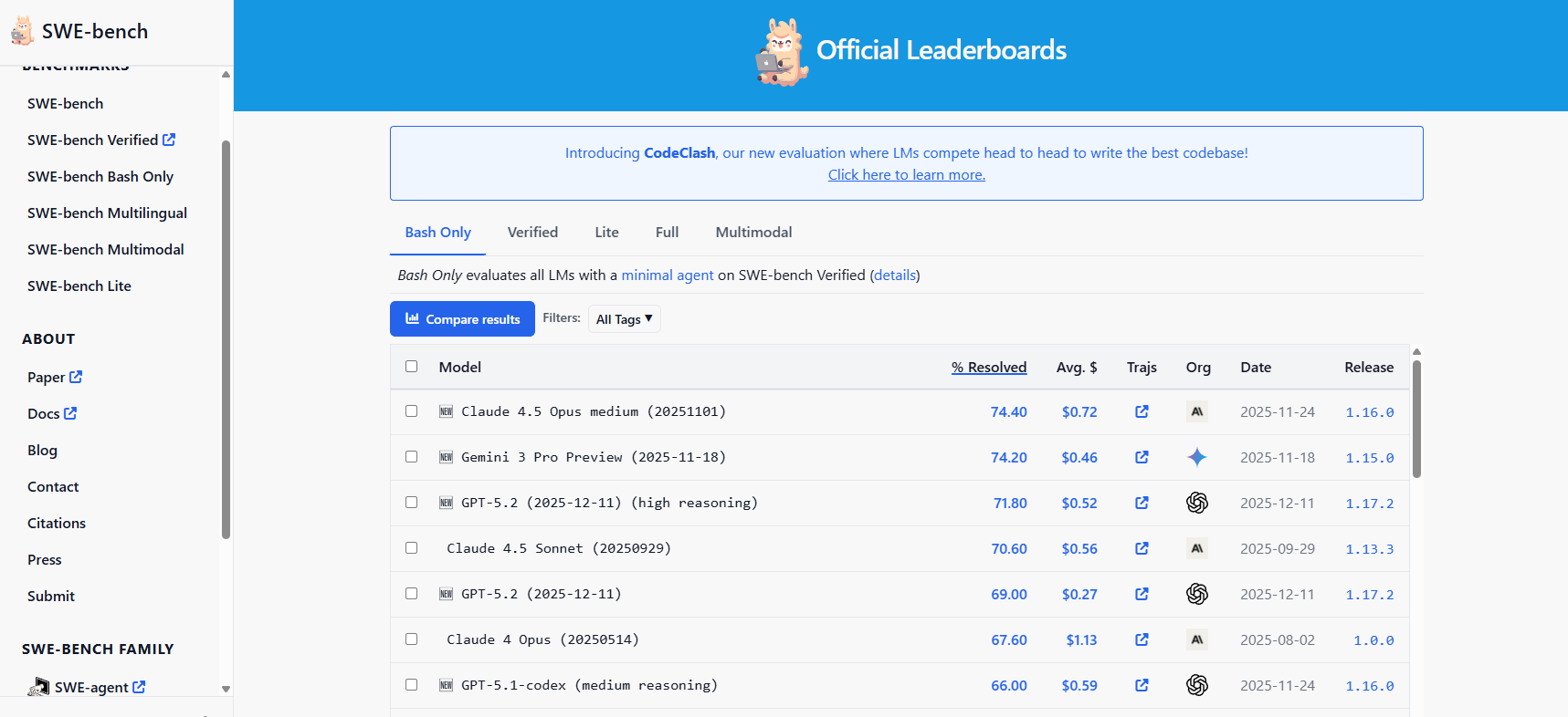 リーダーボードには複数の条件があり、本記事では「Bash Only / Verified」条件の結果を前提にしています。2025年12月24日時点では、Claude 4.5 Opusが74.40%、Gemini 3 Pro Previewが74.20%、GPT-5.2(high reasoning)が71.80%という並びになっています。