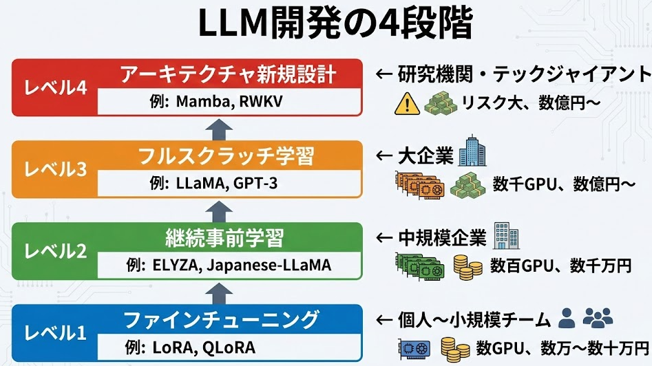 | 用途例 | チャットボット、タスク特化 | 日本語追加、専門知識 | 独自基盤モデル |