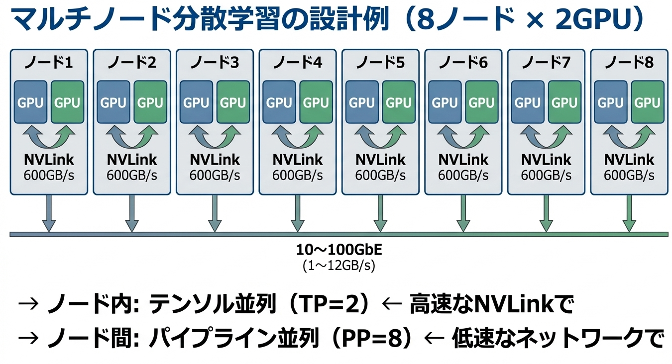 頻繁に通信が必要な処理(テンソル並列など)はノード内のNVLinkで完結させ、通信頻度が低い処理(パイプライン並列など)をノード間で行う、という設計が一般的です。