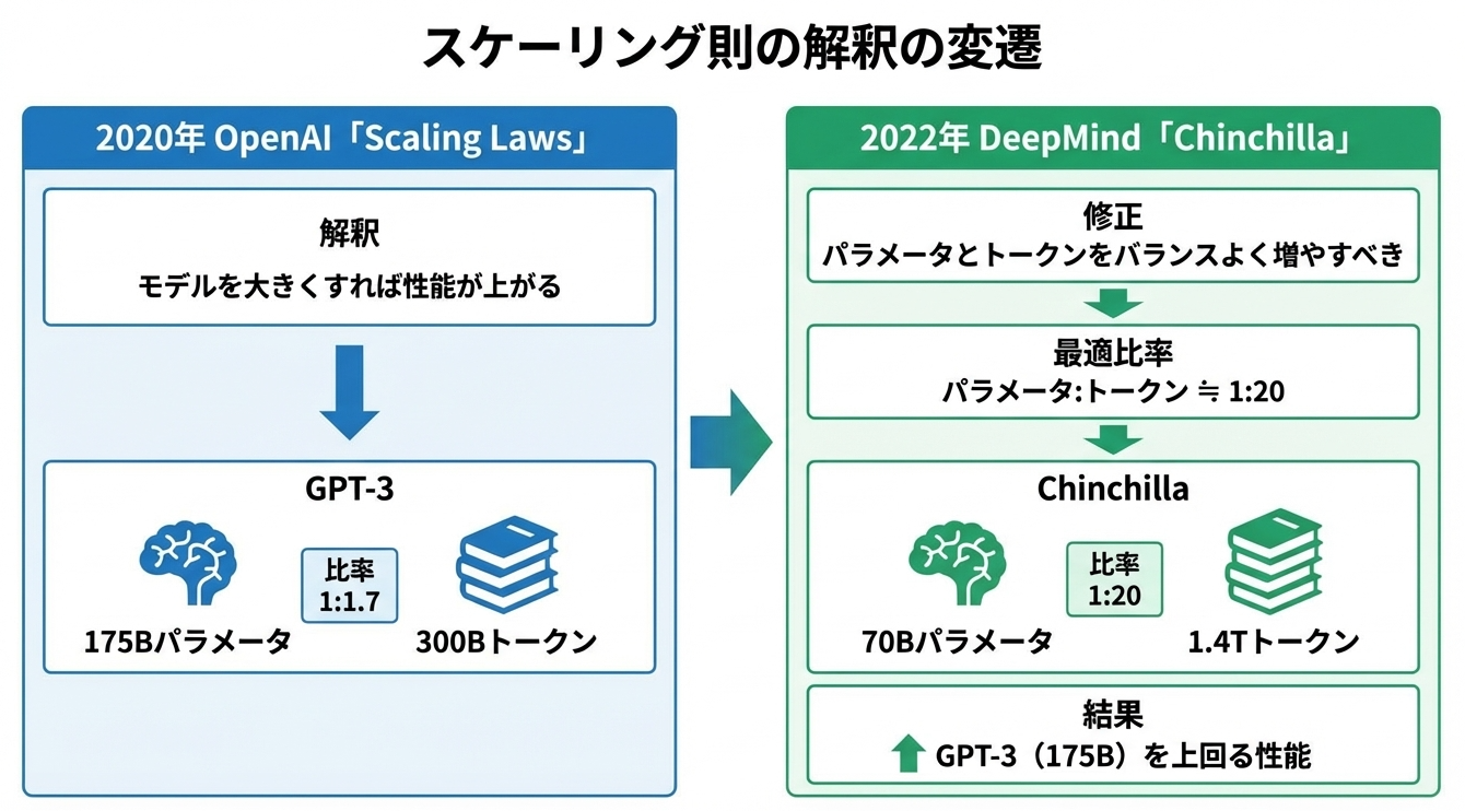 この観点からGPT-3を見ると、明らかに「学習不足」でした。1750億パラメータに対して3000億トークンしか学習していません。最適比率に従えば、3.5兆トークン程度が必要だったことになります。