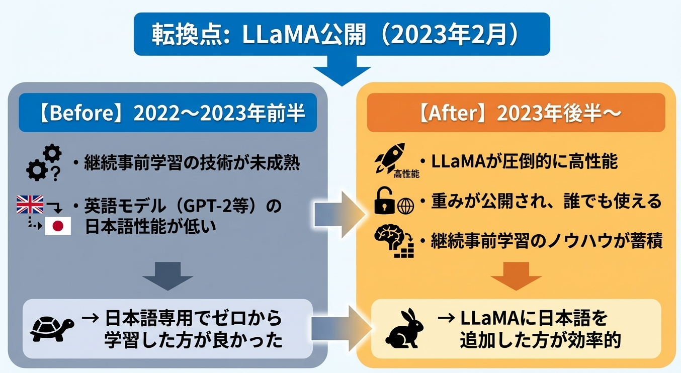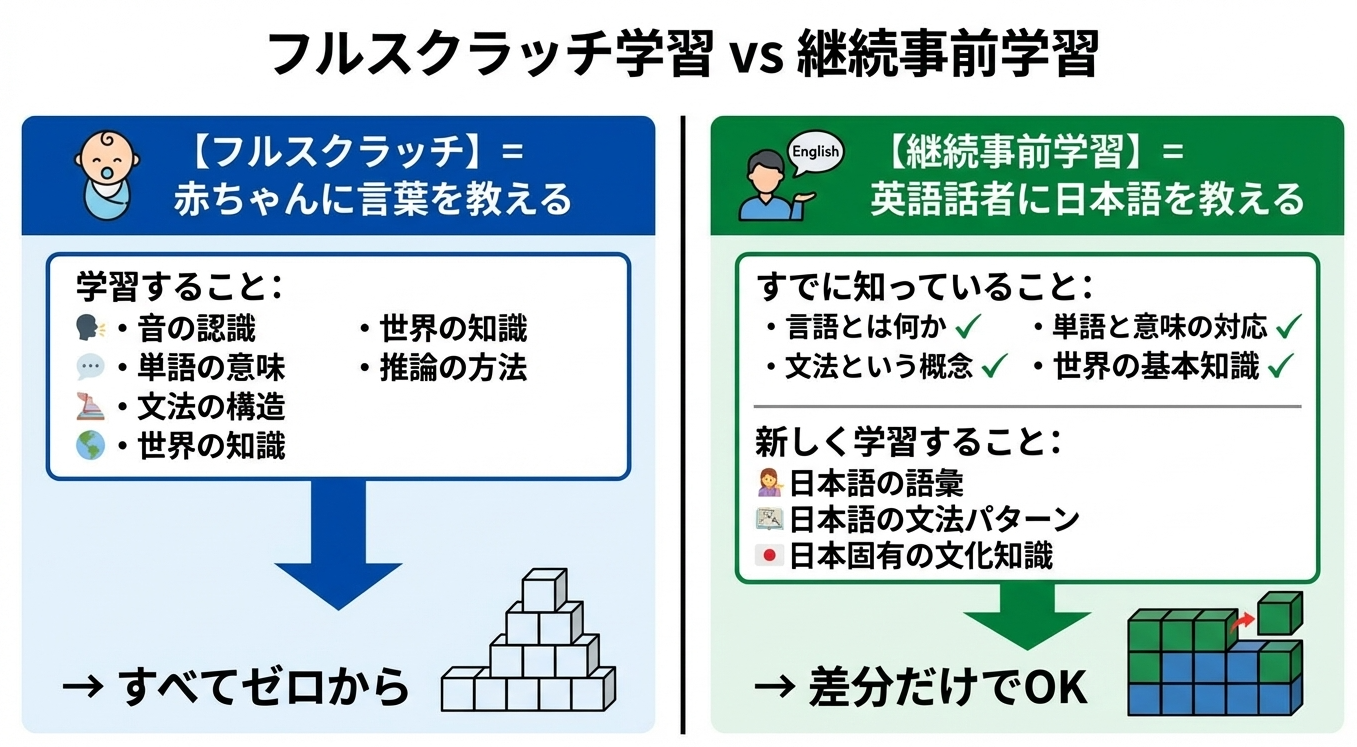 継続事前学習への移行が進んだ理由は、効率の違いです。LLaMAはすでに「言語モデルとしての基礎能力」を持っています。日本語をゼロから学習するより、LLaMAに日本語を追加する方が、同じ計算コストで高い性能が得られることがわかってきました。