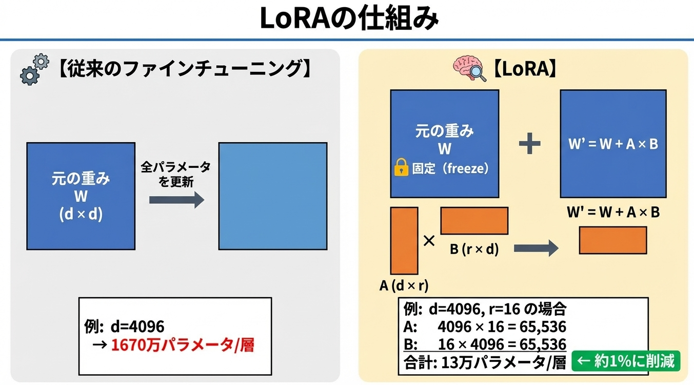 | ファインチューニング | 数% | LoRA、QLoRA |