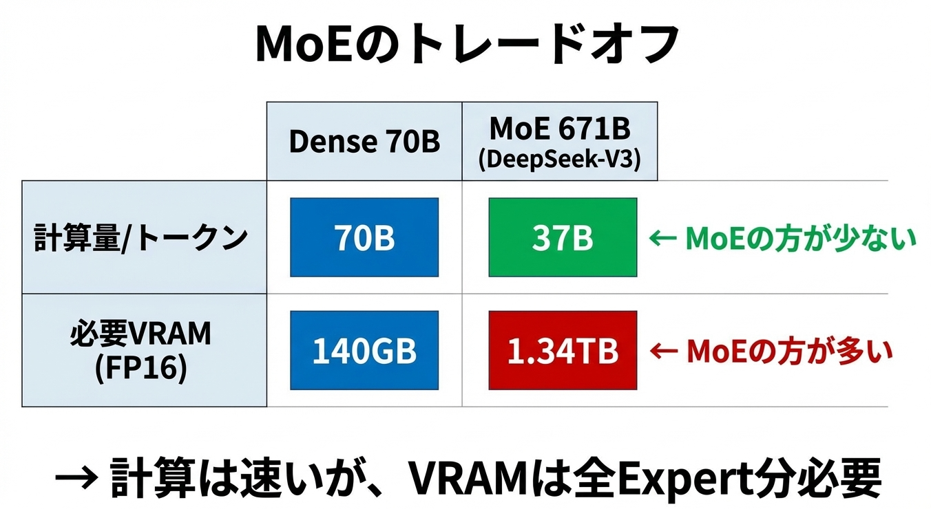 これに加えて、推論時にはKV(Key-Value)キャッシュのためのVRAMも必要です。長いコンテキストを扱う場合、KVキャッシュだけで数十GBを消費することもあります。