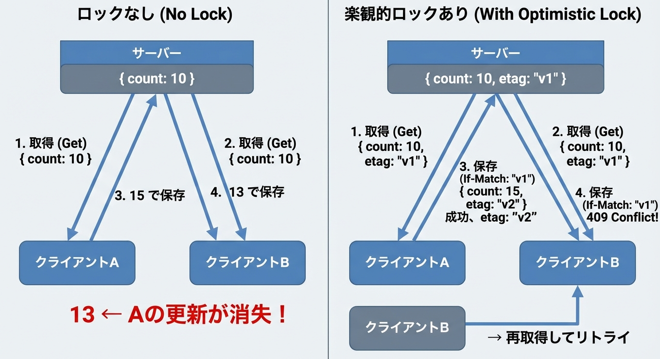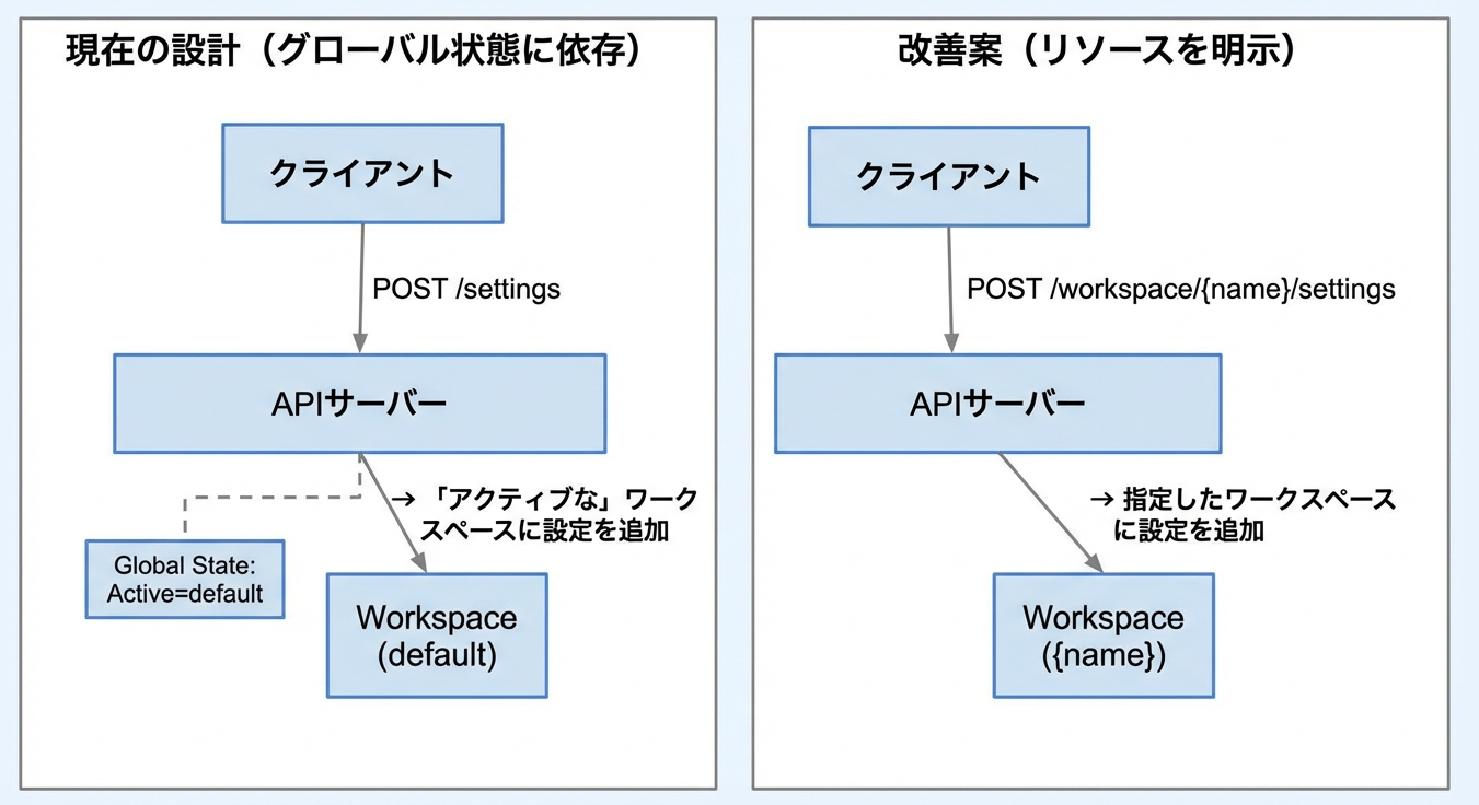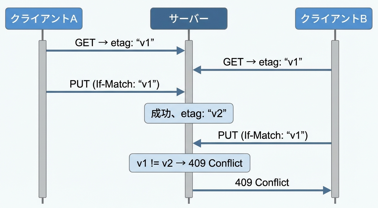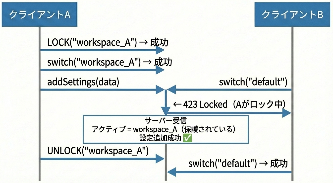 改善案の設計なら、リクエスト自体に操作対象が含まれるため、グローバルな「アクティブ状態」に依存しません。各ワークスペースに対して楽観的ロック(ETag)を適用すれば、競合を検出できます。