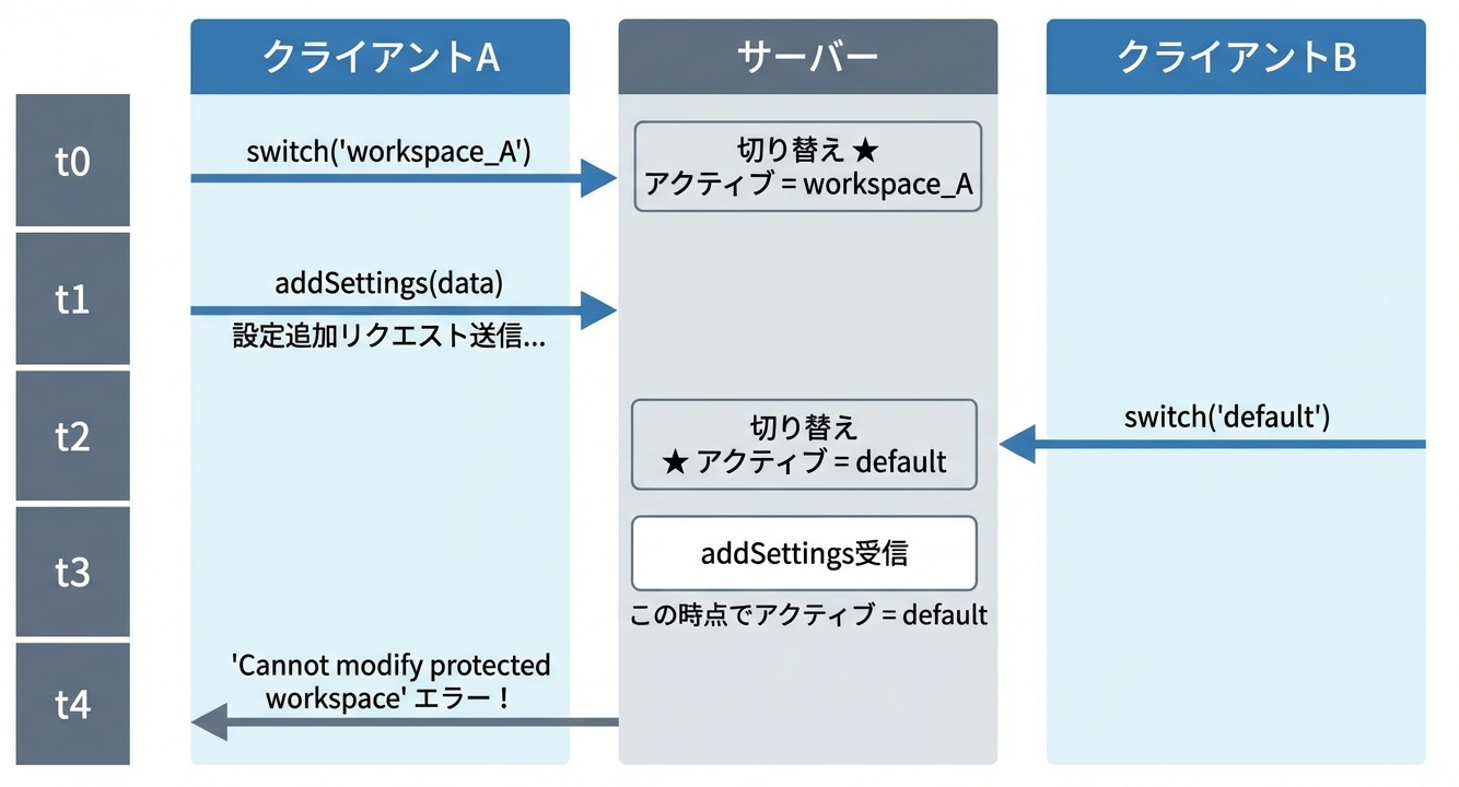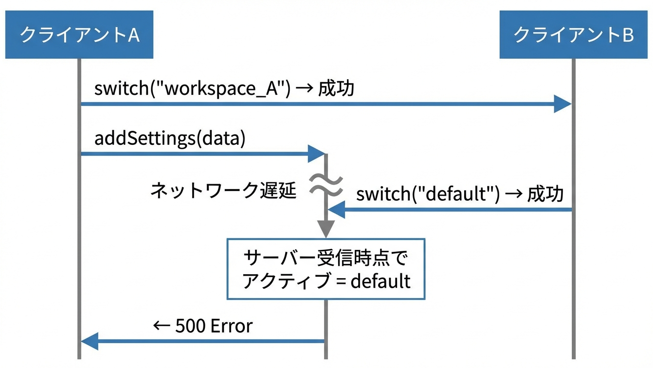 何が起きたかというと、クライアントAがリクエストを送信してからサーバーに到達するまでの間に、クライアントBがアクティブワークスペース(グローバル状態)を切り替えてしまったのです。