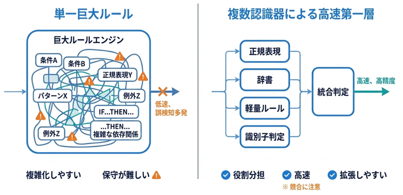 重要なのは、この構成が単なる正規表現パターンの追加ではないという点です。高速性を保ったまま検出範囲を広げようとすると、巨大な単一ルールに集約するよりも、役割ごとに認識器を分けたほうが設計しやすくなります。しかしその代償として、今度は各認識器が互いに干渉する問題が表面化します。