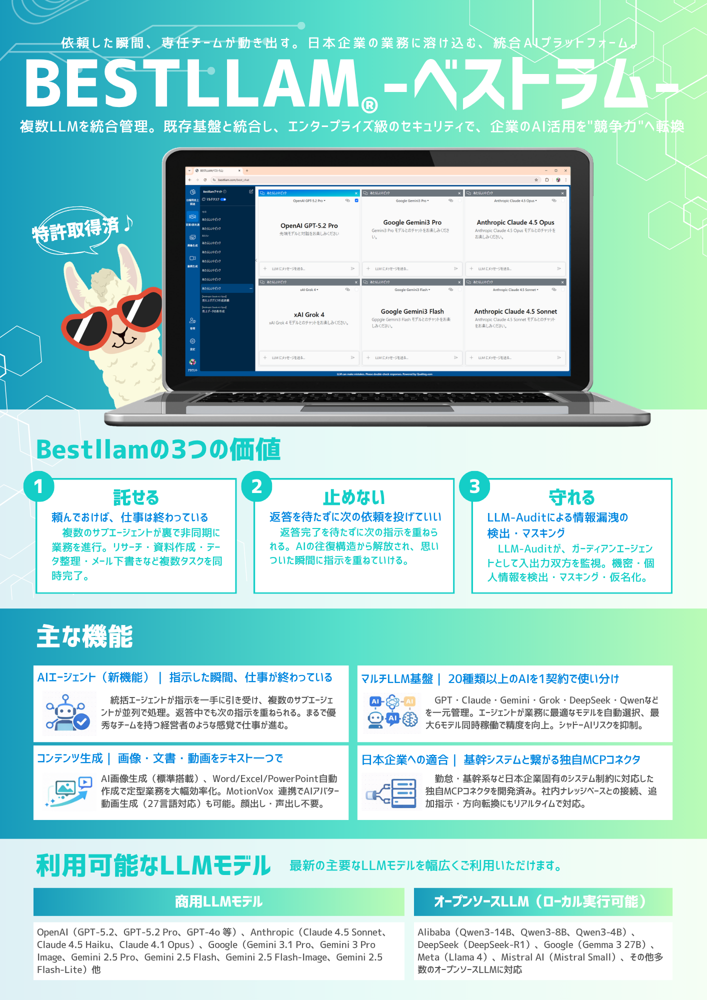 「Bestllamのエージェント、うちの部署で試してみたい」 「LLM-Auditの話、情シスに共有したい」 「Qualitegのコンサル、まず1回相談させて」