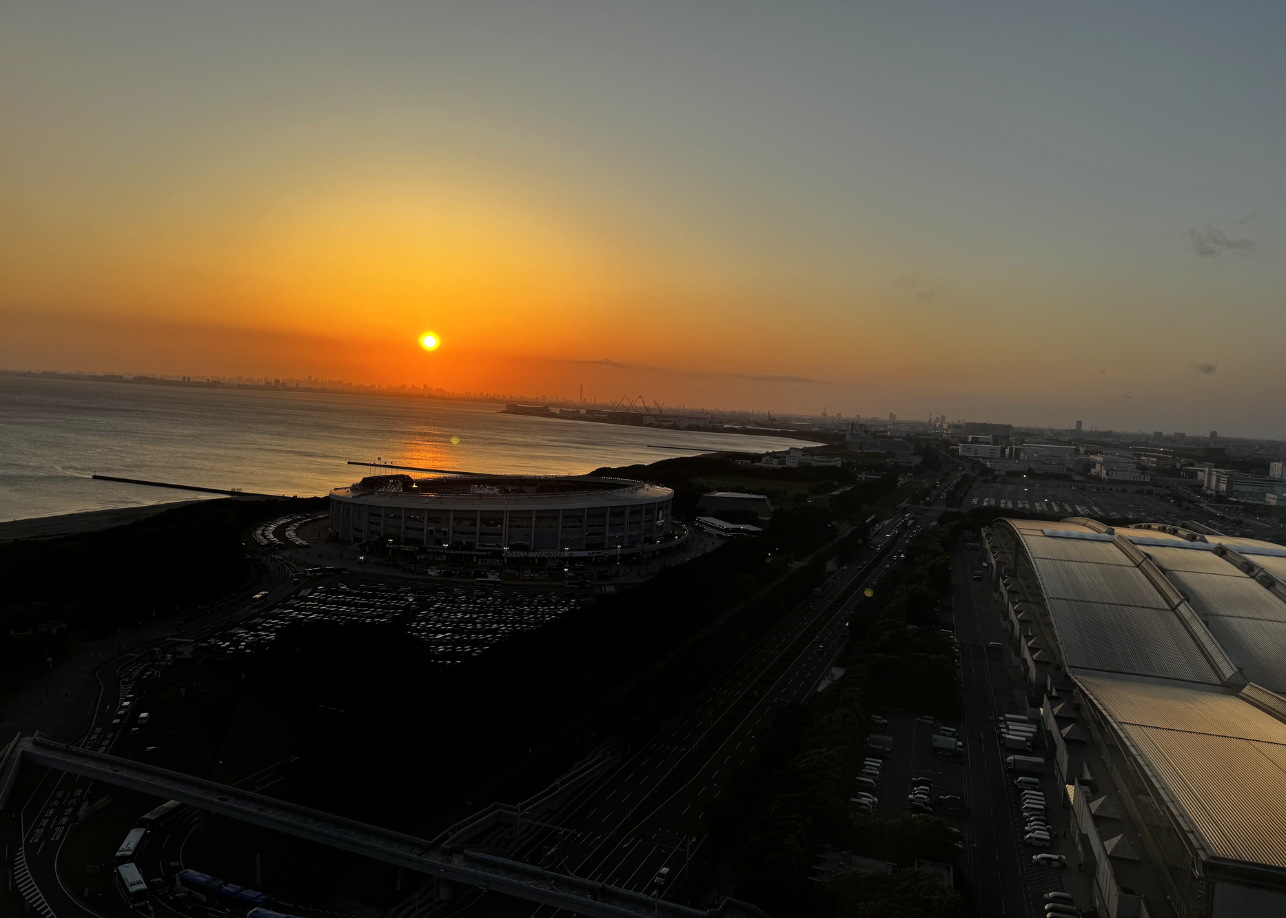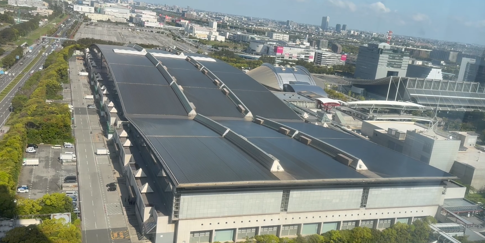 幕張メッセの屋根が、光を反射してキラキラ光ってる