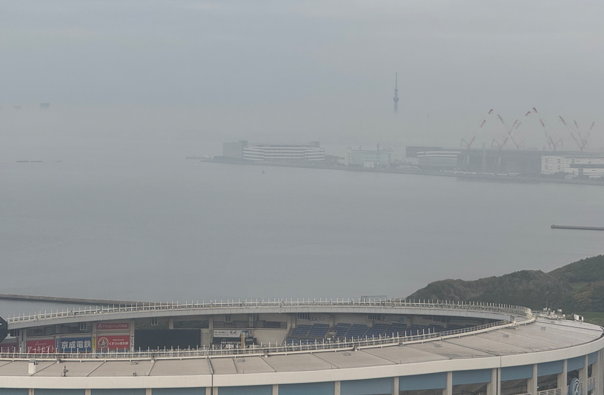 zozoマリンスタジアムの奥、白みはじめた東京湾の向こうに、うっすらと塔のようなものが浮かんでいました、