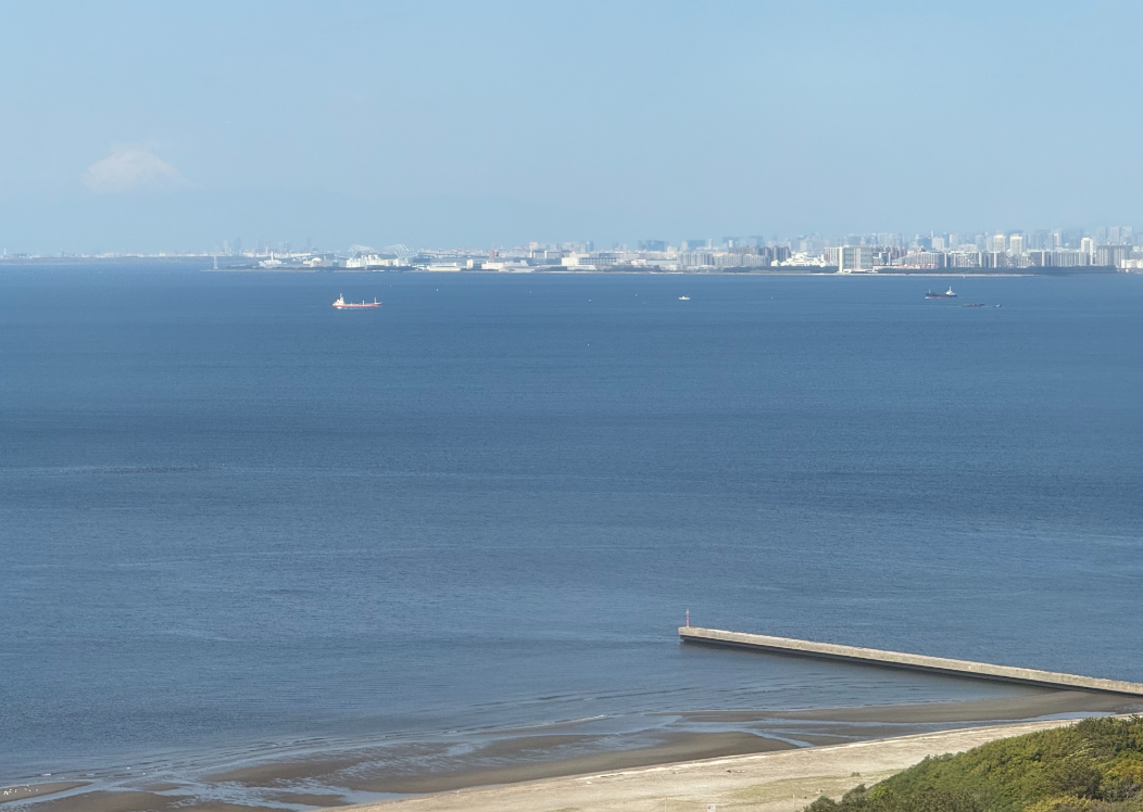 前日の曇天とは打って変わって、東京湾の向こうからうっすらした富士山、